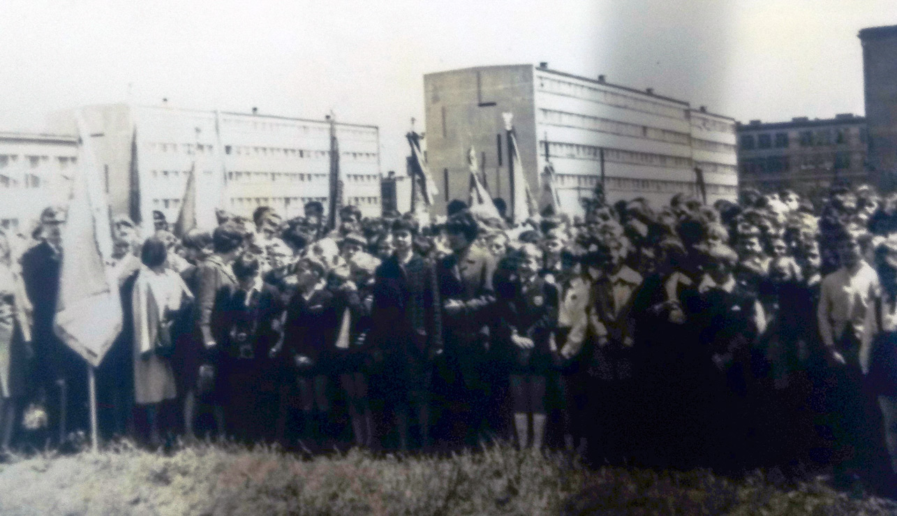 Edwarda Wojtysiaka (kierownika szkoły w 1967 roku) wraz ze sztandarem SP 81 (zob. zdjęcie: Sztandar szkoły w publikacji).