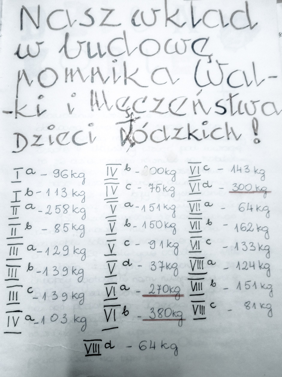 W kronice sporządzono także wykaz, ile kilogramów papierów przynieśli uczniowie z poszczególnych klas, by dochód uzyskany z ich sprzedaży przekazać na rzecz budowy monumentu (zob. zdjęcie: Wkład poszczególnych klas).