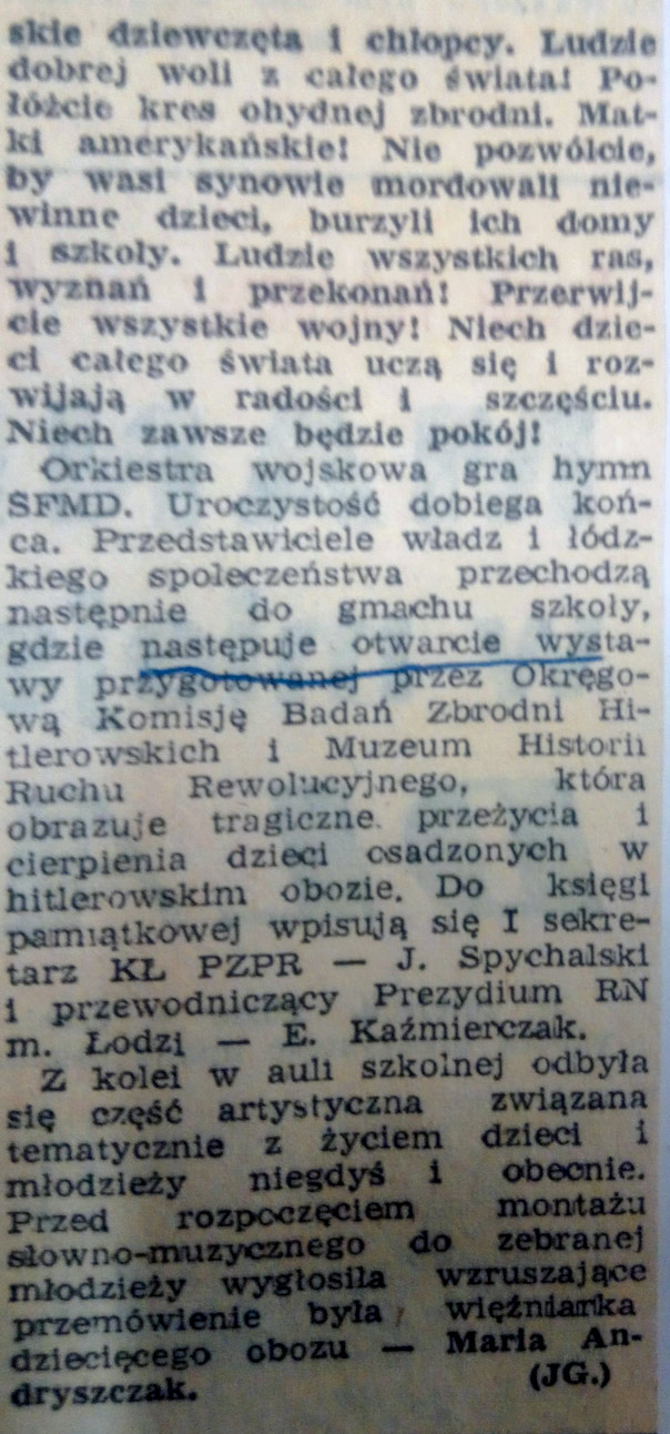 Chronologicznie można przyporządkować tę informację do kronik, które opisują rok 1966, bowiem otwarcie wystawy towarzyszyło nadaniu szkole imienia Bohaterskich Dzieci Łodzi.